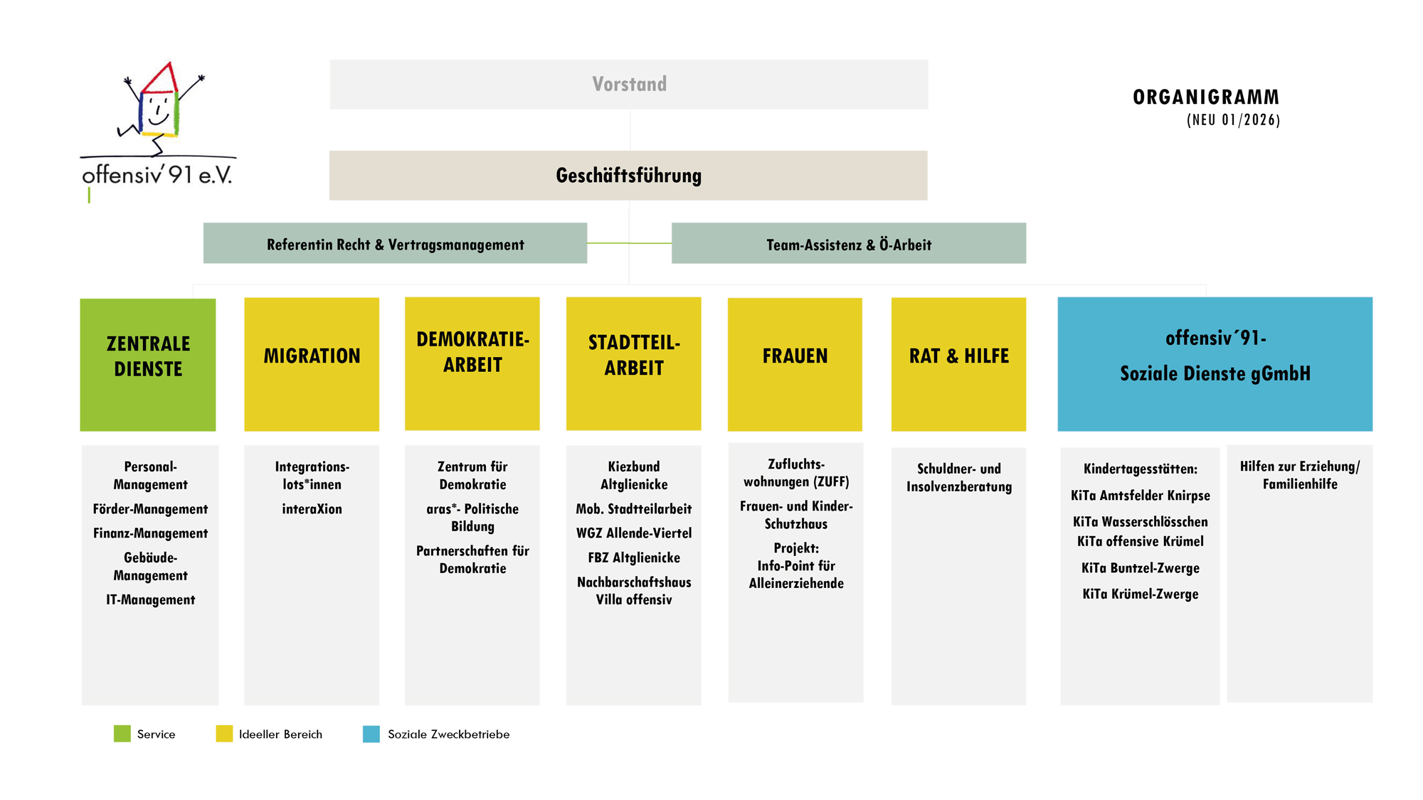 Die Geschäftsstelle von offensiv´91 ist der zentrale Anlaufpunkt für alle administrativen und organisatorischen Aufgaben. Hier arbeiten unsere engagierten Mitarbeitenden daran, optimale Strukturen für die Projekte und Fachbereiche des Trägers und seiner Tochtergesellschaft aufzustellen.